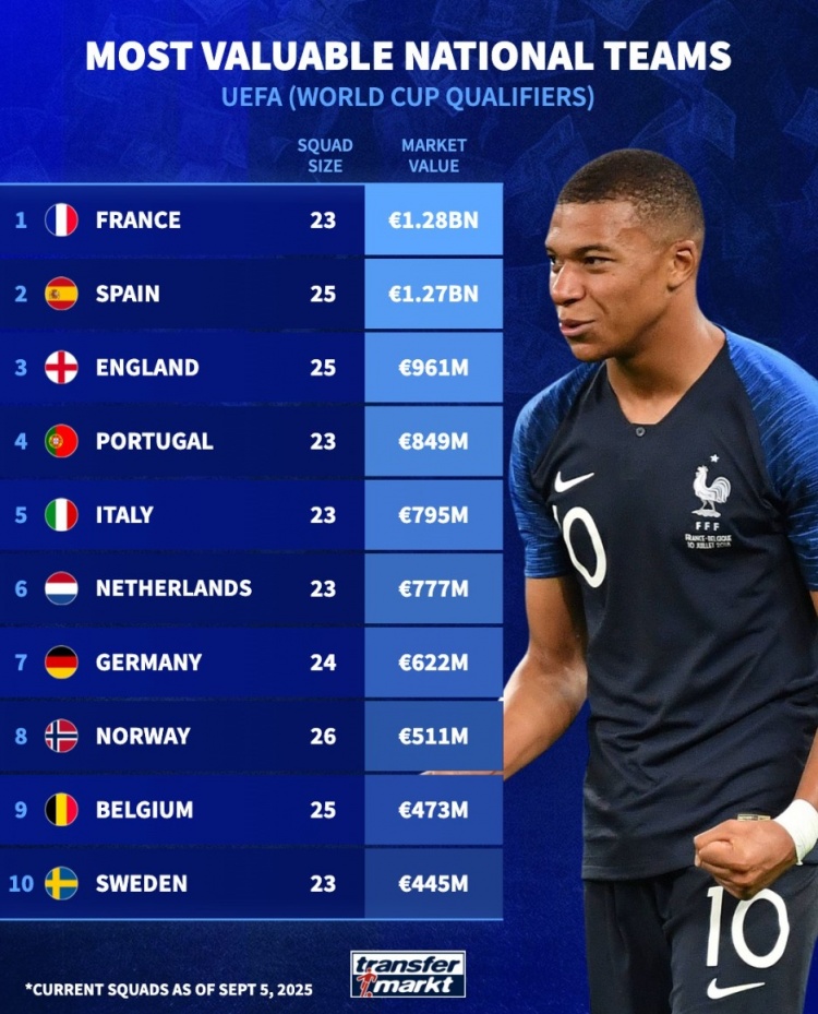 9月6日讯 世欧预正在进行中,《转会市场》也统计了本期欧洲国家队阵容身价情况,法国力压西班牙居首。
