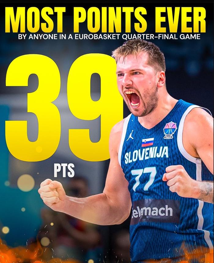 东契奇在1/4决赛中,鏖战33分钟,25中11,三分16中5,罚球15中12,拿到39分10篮板7助攻,他再一次一人扛起球队,但斯洛文尼亚因为综合实力孱弱最终被德国逆转,东契奇无缘四强。