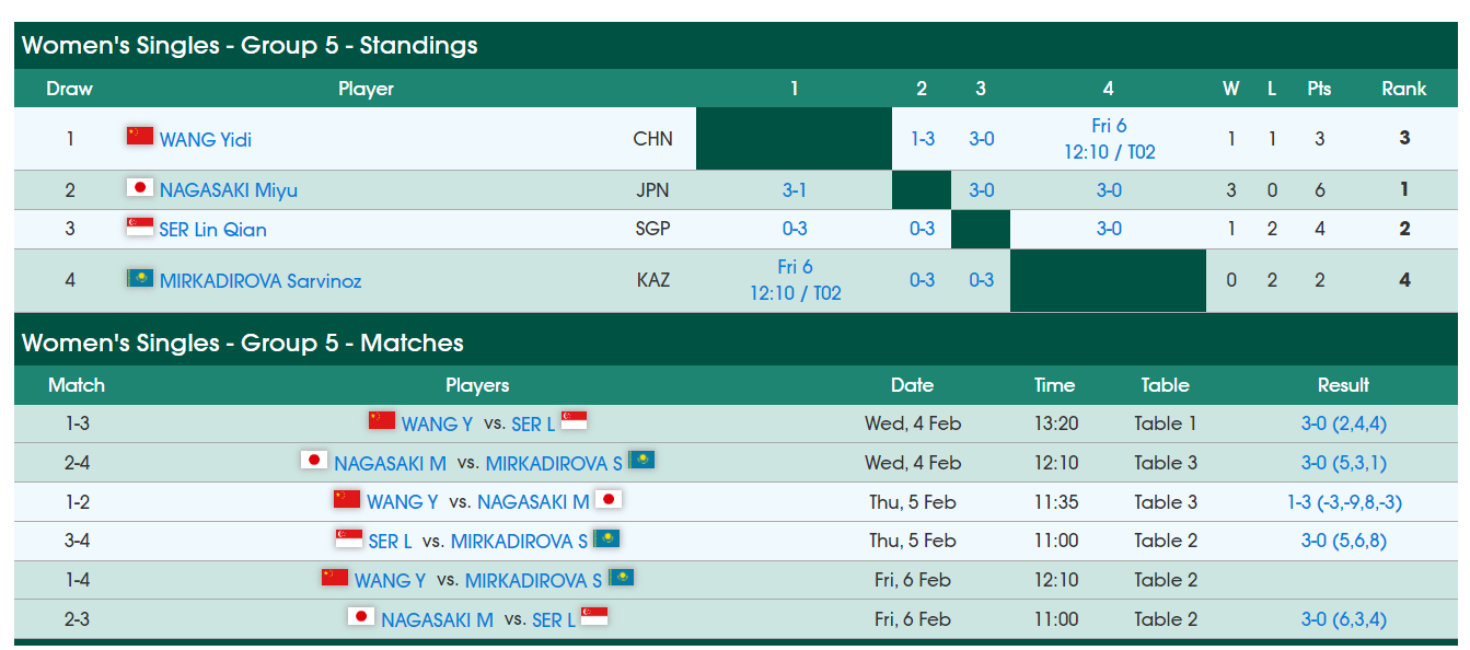 王艺迪VS米尔卡迪罗娃这场比赛之前,日乒23岁的长崎美柚已经完成了三连胜,她3-0舒麟茜、3-1王艺迪、3-0米尔卡迪罗娃轻松晋级16强,长崎美柚也是小组第一。